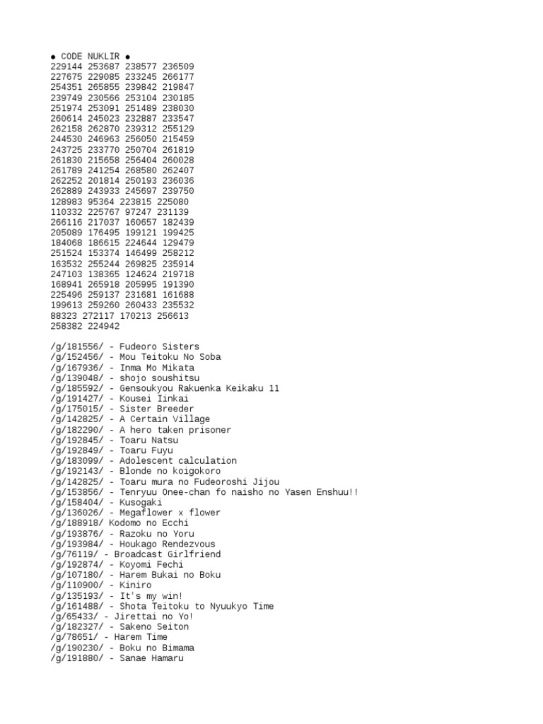 Kode nuklir merupakan kumpulan angka 6 digit yang digunakan para wibu dan otaku untuk menscrypt. 1,587 likes · 111 talking about this.apa itu kode nuklir dan bagaimana cara menggunakan nya tonton video ini. S a d '( cara memasukan kode nuklir di telegram bagi bagi code nuklir nih dosa tanggung sendiri y. Customer database in excel template download / cus. Kode nuklir, 287892, 304106, 325367, 280782, tujuan kota bandung dijadikan lautan api adalah, cara menggunakan kode nuklir wibu, cara pake kode nuklir, kode nuklir asuna, 330814, Kode nuklir gotoubun no hanayome подробнее. Maka tidak heran jika banyak orang terutama pengguna internet yang terus mencari kode tersebut. Jenderal tertinggi as presiden punya kekuasaan tunggal untuk serangan nuklir. Yo, welcome back to my chanel. Book of abstracts for printing 10july2019 published pages 51 100 flip pdf download fliphtml5. Sale iskandar may 18, 2021 leave a comment. Kode nuklir ini angka untuk menuju anime atau manga yang tidak terbit di indonesia, 197025 menunjuk pada sebuah anime/ manga hom053ksual. Mengenai sebuah anime tentu setiap minggunya selalu ada saja yang baru, jadi tentunya admin akan memberikan update terbaru setiap minggunya.